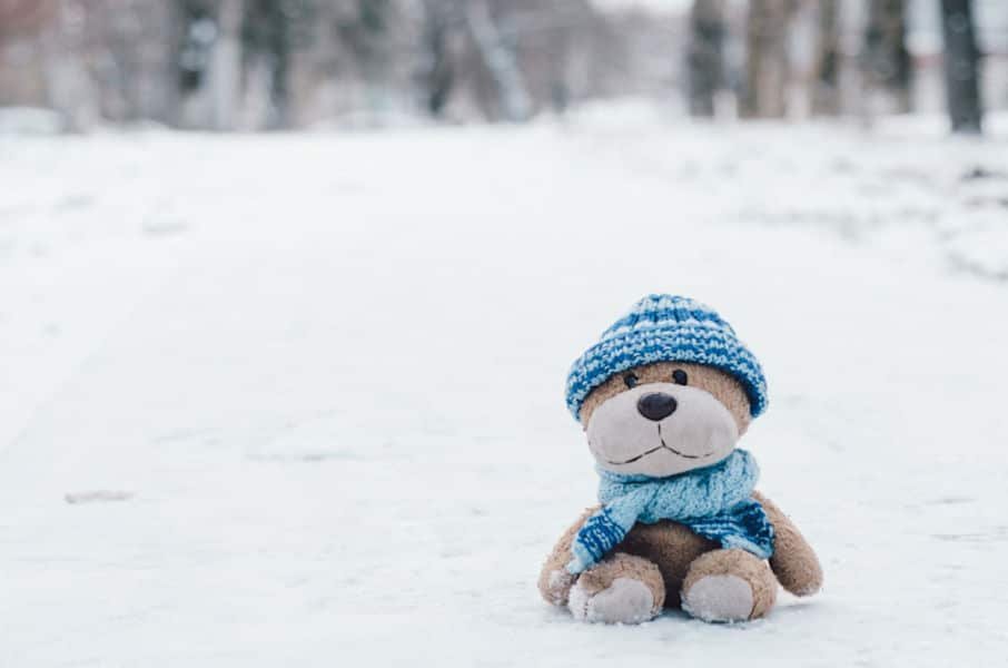 Teddy bear dressed in blue hat and scarf sitting in the snow.
